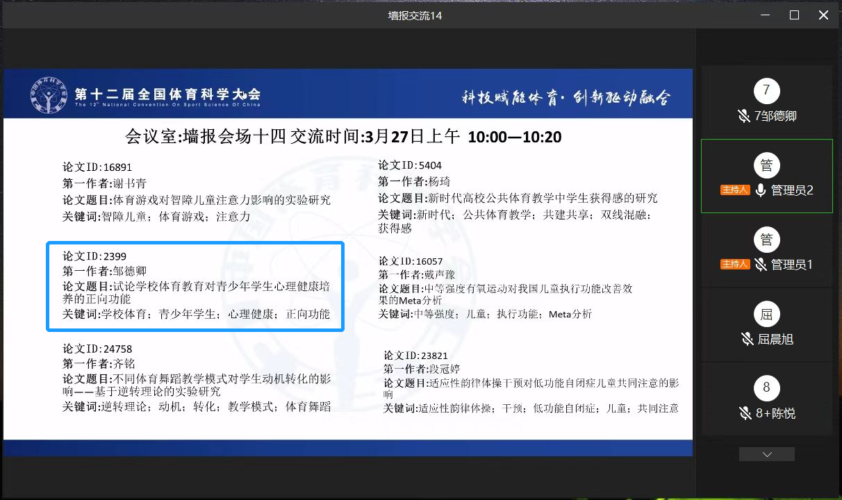 第十二届全国体育科学大会于2022年3月25日-27日在山东日照举办。36365最新线路检测中心按照学校《关于36365师生参加第十二届全国体育科学大会相关事宜的通知》要求,积极组织师生参加第十二届全国体育科学大会,教师报告5人次,墙报交流13人次,学生报告28人次、墙报交流40人次。通过本次活动,我院师生拓宽了学术视野,深入了解了学科前沿动态,收获颇丰。因疫情原因,学院全体师生线上观看了本次全国体育科学大会开幕式和主题报告。
