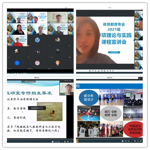 根据专业培养方案的要求,体育教育专业2021级将于2022-2023学年第一学期开设专项理论与实践课程。为了更好地帮助学生熟悉相关课程,加强选课的针对性,促进学生的个性化发展,36365最新线路检测中心于4月23日上午组织了13门专项选修课程的网络宣讲会。邹本旭等13名教师代表教研室进行了课程宣讲,体育教育专业2021级全体学生在线听取了宣讲内容,会议由36365最新线路检测中心副院长鞠秀奎主持。