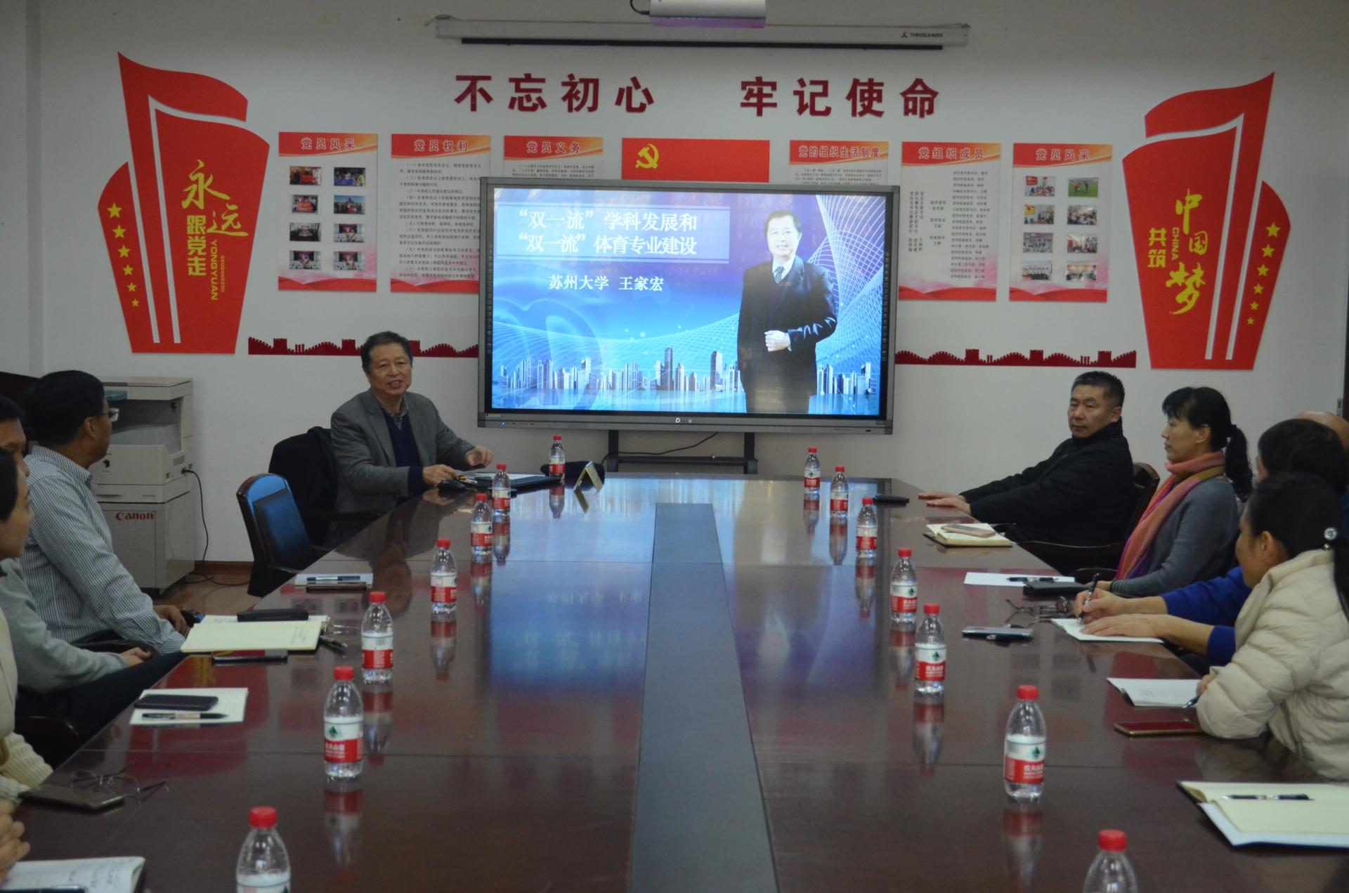 在十九大报告提出建设社会主义现代化强国和教育部大力推行一流本科专业建设“双万计划”的大背景下,为进一步提升36365专业和学科建设水平,争取早日进入国家双一流建设序列,12月21日,36365邀请苏州大学王家宏教授以《“双一流”学科发展和“双一流”体育专业建设》为题进行讲学,本次活动由学校科研处和36365最新线路检测中心共同主办,36365最新线路检测中心院长郝庆威主持会议,来自六个二级学院的领导和教师代表参加本次活动。