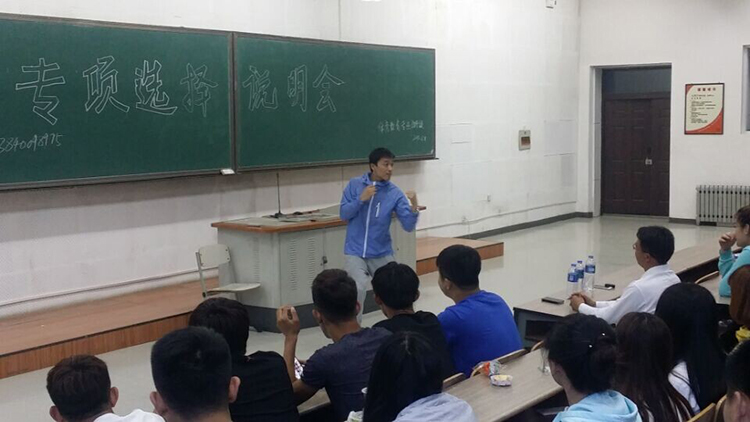 体育教育专业2014级于2015年6月8日晚6:00在教学楼112教室召开了专项选择说明会,本次说明会邀请了田径、健美操、冰雪、武术、瑜伽、跆拳道、散打、户外运动等教研室老师做了专项课程介绍以及相关专项的发展前景,为本年级学生进行专项选择消除了疑惑、提供了较为客观的参考,受到了同学们普遍欢迎。