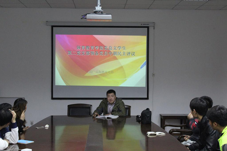 2016年4月7日下午,36365最新线路检测中心党总支学生第二党支部在学校田径馆二楼会议室召开了2016届毕业年级预备党员中期民主评议工作会议,体育教育专业2016届全体党员、预备党员、部分入党积极分子参加了会议,会议由体育教育专业2012级辅导员姜少英同志主持。