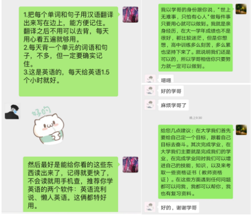 线上助学在行动通过选取成绩、品行优异的高年级学生党员、学生干部等在疫情期间担任较低年级的学长班主任,借助网络平台带动、鼓励低年级的学弟、学妹们在家积极参与学习活动。学长班主任利用网络线上向学弟学妹们介绍学习经验方法,专业课重难点突破技巧、教师资格证考试经验等助学信息。他们积极发挥带头作用,热情主动地与学弟学妹们交流互动,在线答疑解惑,并建议学弟学妹们在疫情期间要合理利用时间,做到“停课不停学”,保持学习热情,不断提升自我。