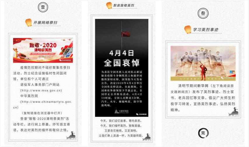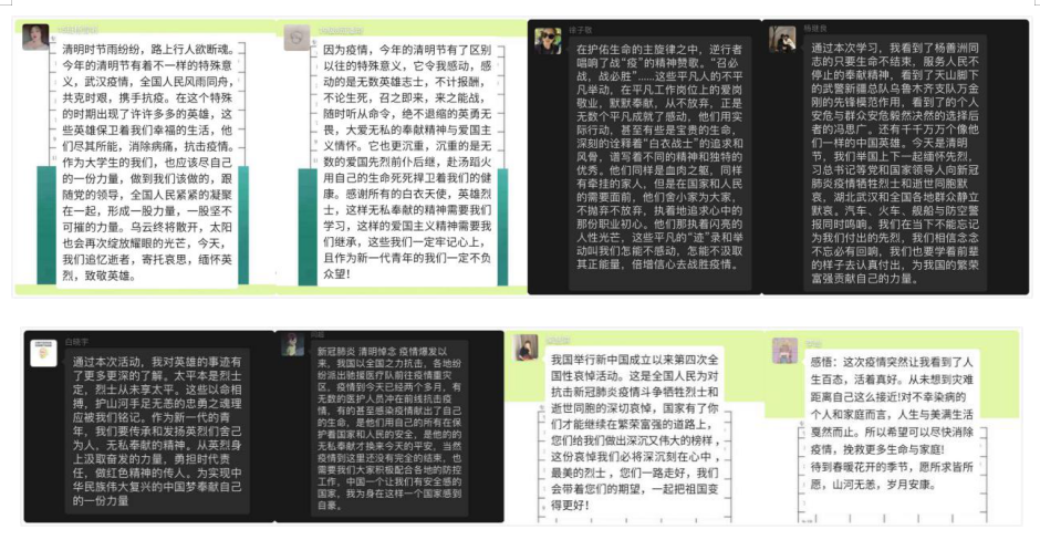 同学们采用云祭扫献花,默哀致敬英烈以及学习英烈事迹等多种形式开展系列纪念活动。通过此次活动,同学们对抗疫英雄和革命先烈的事迹有了更深的了解,激发了同学们的爱国热情,使每个人重新接受了一次爱国主义教育,营造了学习英烈故事,崇尚英烈精神的浓厚氛围,展现了当代大学生的青春面貌与风采。