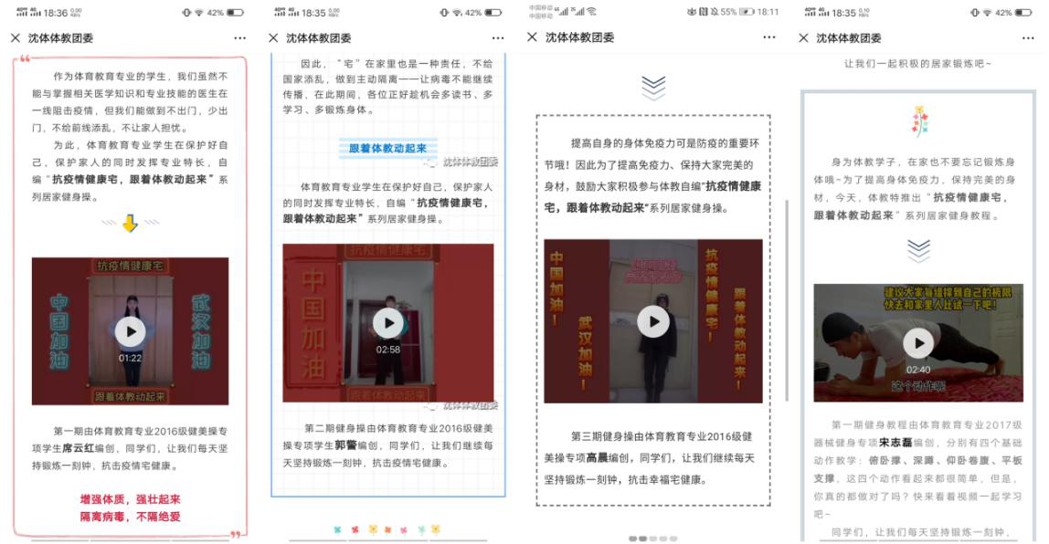 居家健身微视频简单易学,针对性、趣味性强,为学生提供了切实可行的居家健身专业指导。目前,该系列微视频分别通过“沈体体教团委”微信公众平台推送了6期,“36365最新线路检测中心”抖音号推送了10余期,广大学生积极响应,全力配合,并且带动其家人朋友共同踊跃参与其中,受到了大家的一致认可与好评,取得了良好的预期效果。